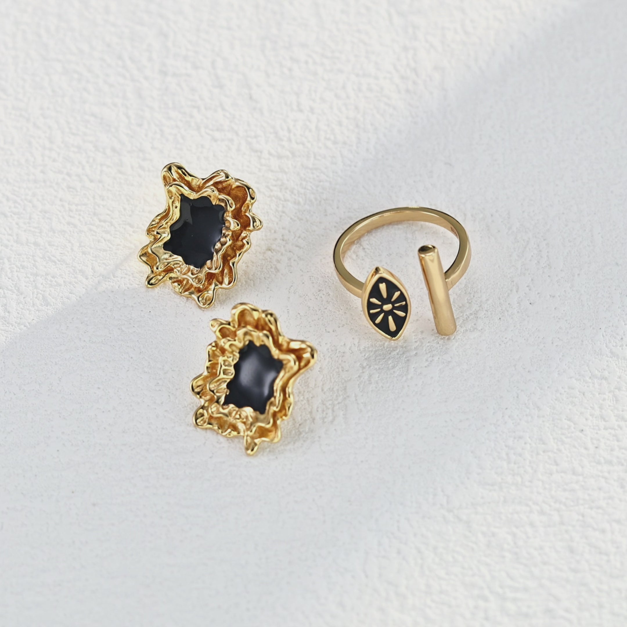Artistic Enamel Drop Ring – Vintage Gold Adjustable Design with Modern Edge