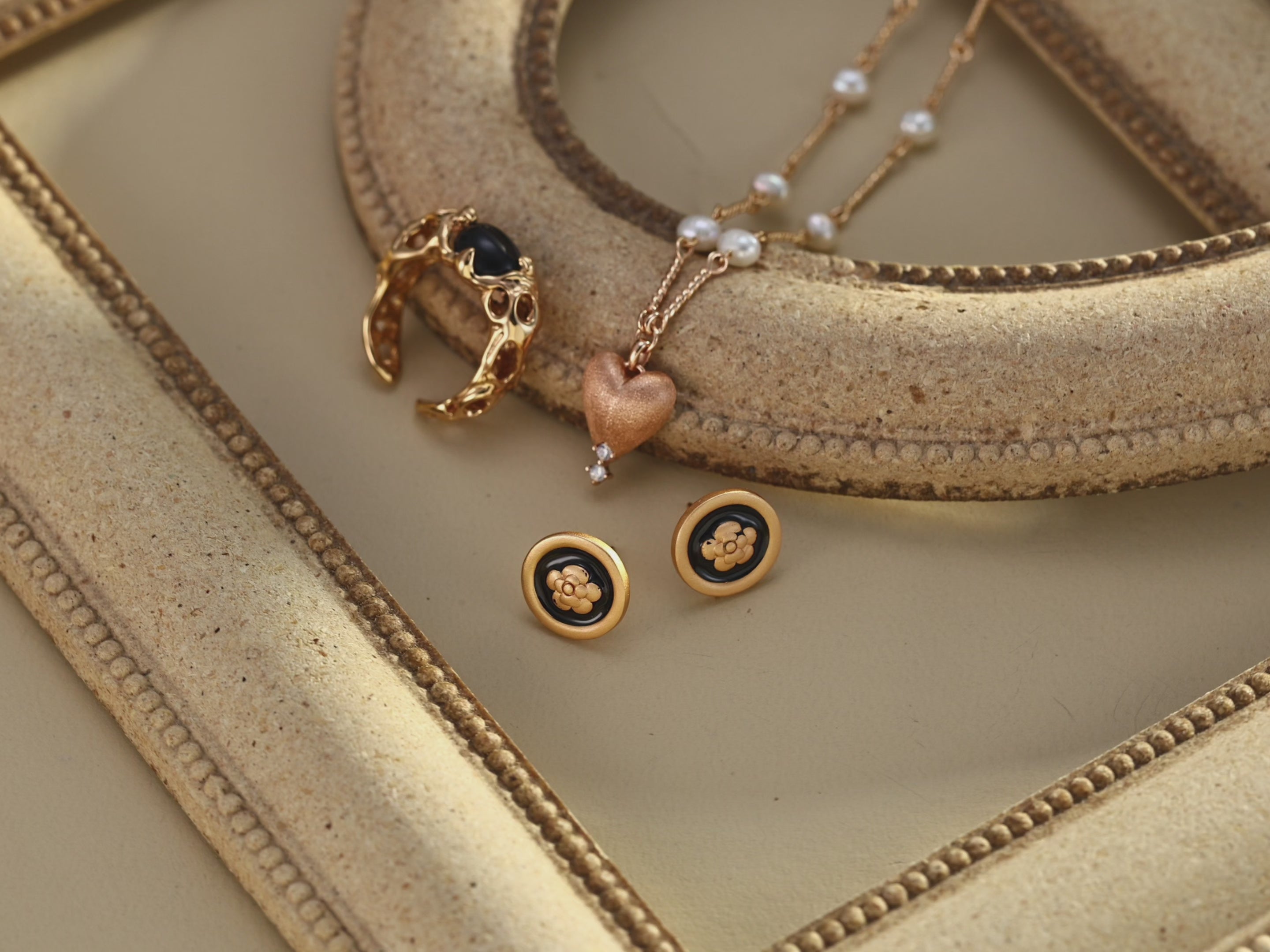 Infused with the quiet poetry of Parisian minimalism, this necklace balances the gentle glow of natural pearls with the artistry of a sand-matte pendant. The inlaid gemstone adds a touch of sparkle, like starlight against soft dusk. With its vintage gold finish, the piece evokes timeless French romance and refined sophistication — a jewel that graces both casual elegance and evening allure.