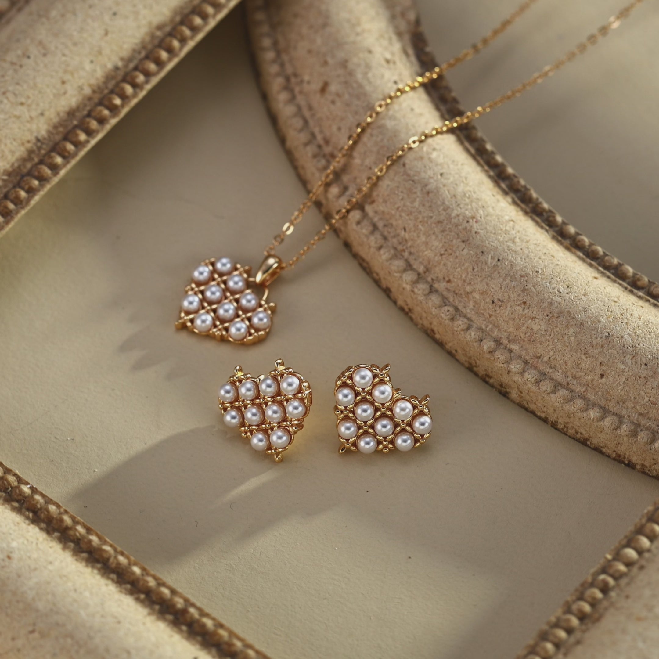 This vintage-inspired heart necklace captures the essence of love and timeless romance. The heart pendant, delicately adorned with lustrous imitation pearls, radiates warmth and femininity. The soft vintage gold plating whispers Parisian charm, making it a versatile piece that transitions effortlessly from everyday wear to elegant occasions. A refined design that embodies grace, love, and sophistication.