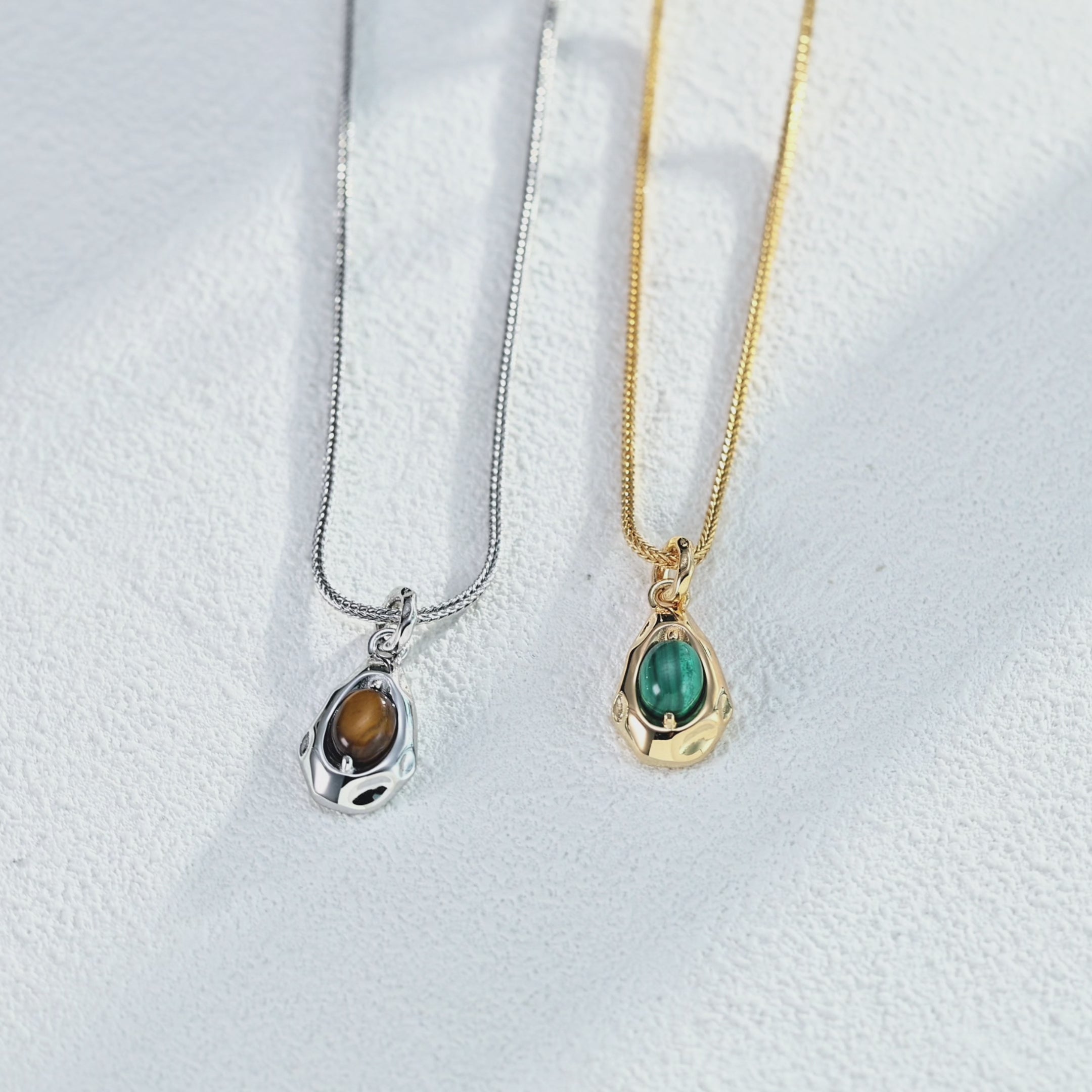 Inspired by the serene beauty of natural gemstones, this necklace blends the protective strength of Tiger Eye with the calming grace of Peacock Stone. The refined sterling silver design, enhanced with vintage gold plating, evokes a sense of effortless Parisian sophistication. Whether worn in the bustling city or on quiet evenings, the pendant becomes a symbol of balance and elegance, illuminating your style with timeless charm.